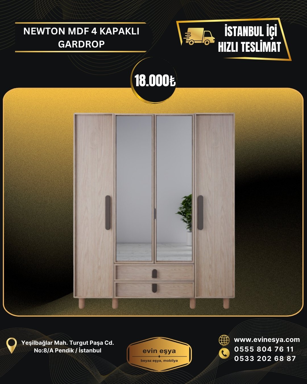 NEWTON MDF ÜRETİM 4 KAPAKLI GARDIROP 18000 TL(GENİŞLİK 160-YÜKSEKLİK 208-DERİNLİK 54)